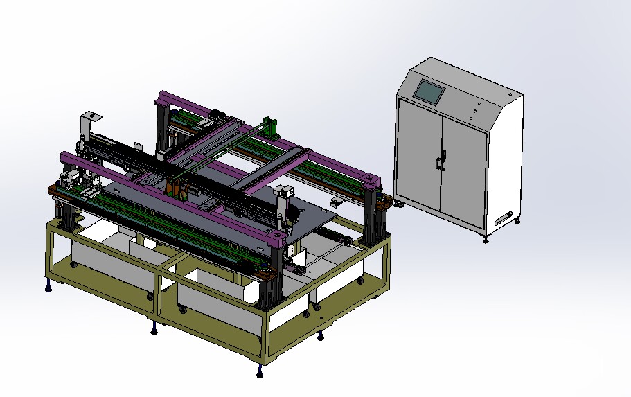 自動(dòng)排版機(jī)的主要功能單元有:玻璃輸送定位系統(tǒng)、抓取行走系統(tǒng)、視覺檢測(cè)系統(tǒng)、電控系統(tǒng)等;通過(guò)以上功能單元,實(shí)現(xiàn)了將自動(dòng)串焊機(jī)串焊好的電池串,按照工藝尺寸要求和排版方向順序自動(dòng)排版鋪設(shè)到玻璃(EVA已經(jīng)鋪設(shè))上,組成電池串陣列。玻璃/EVA通過(guò)傳輸線傳輸至指定位置,機(jī)械手抓取電池串實(shí)現(xiàn)CCD定位、自動(dòng)旋轉(zhuǎn)、自動(dòng)排版功能。設(shè)備通過(guò)同步帶傳輸與自動(dòng)生產(chǎn)線對(duì)接,實(shí)現(xiàn)了自動(dòng)流水作業(yè)。